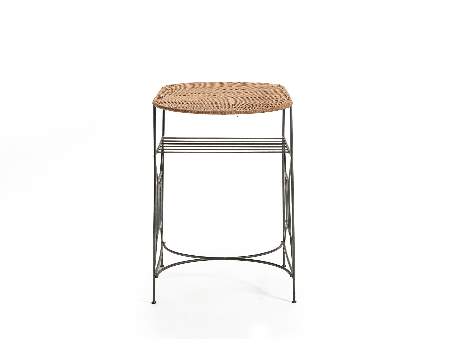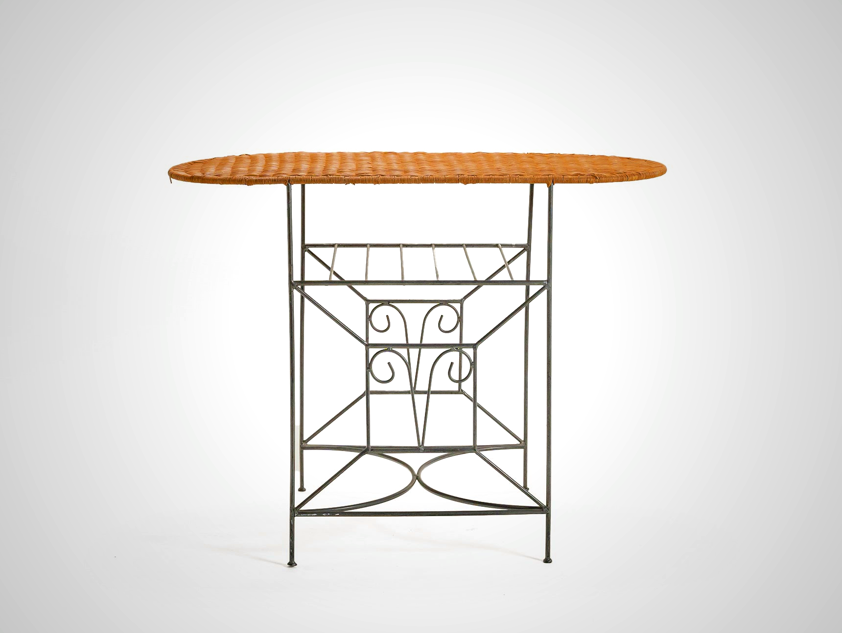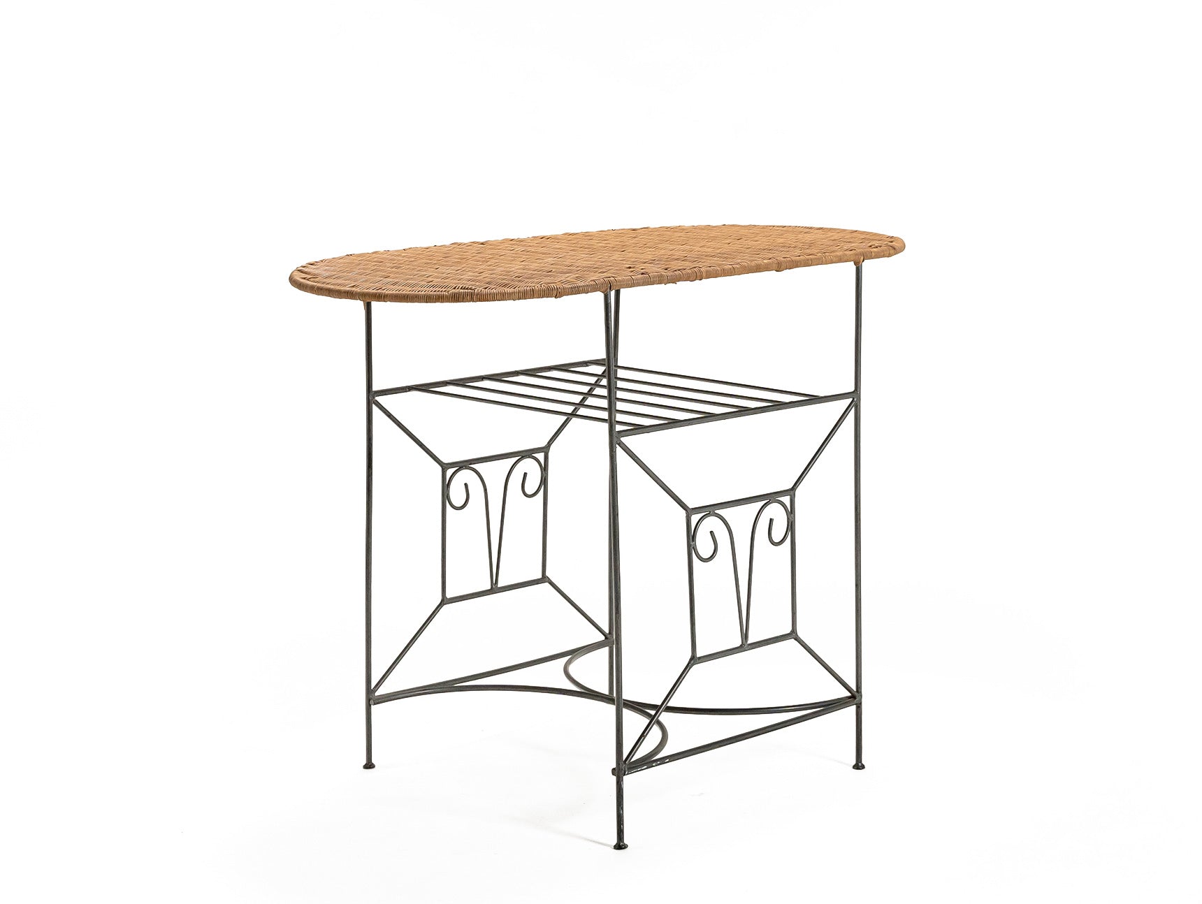 A stylish credenza table featuring an antique iron frame and woven rattan design. Combines durability with natural texture, perfect for rustic, bohemian, or modern interiors. Materials: Rattan, Iron. Condition: Mint. Dimensions: L100.5 x D50.5 x H74.5 cm. Sourced from Tochigi.