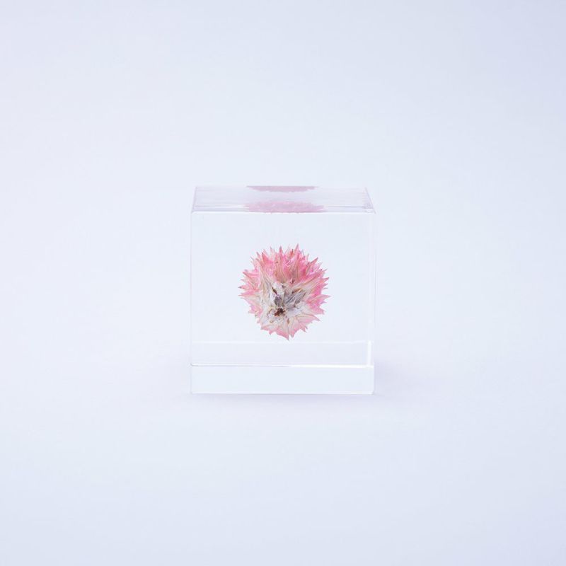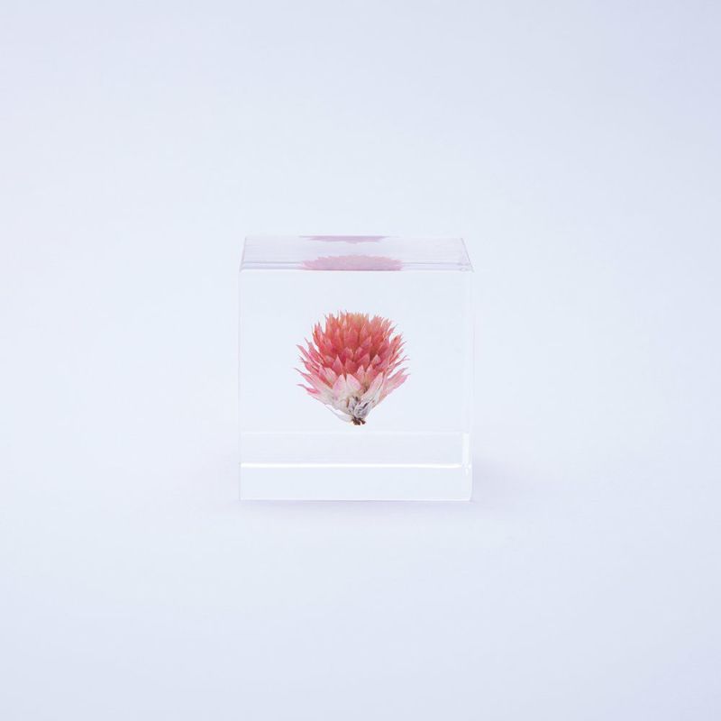 Globe amaranth features pink pom-pom-like calyxes with tiny light yellow speckles, symbolizing long-lasting beauty. Known as ‘Zenichigo’ in Japan, it’s traditionally used in Buddhist arrangements and believed to reflect love’s fate. The Sola Cube by Usage No Nedoko preserves this natural wonder in hand-polished acrylic resin, blending traditional Japanese craftsmanship with modern design. Each piece is unique, showcasing organic elements in a meditative, timeless form. Display indoors away from direct sunlight and heat.