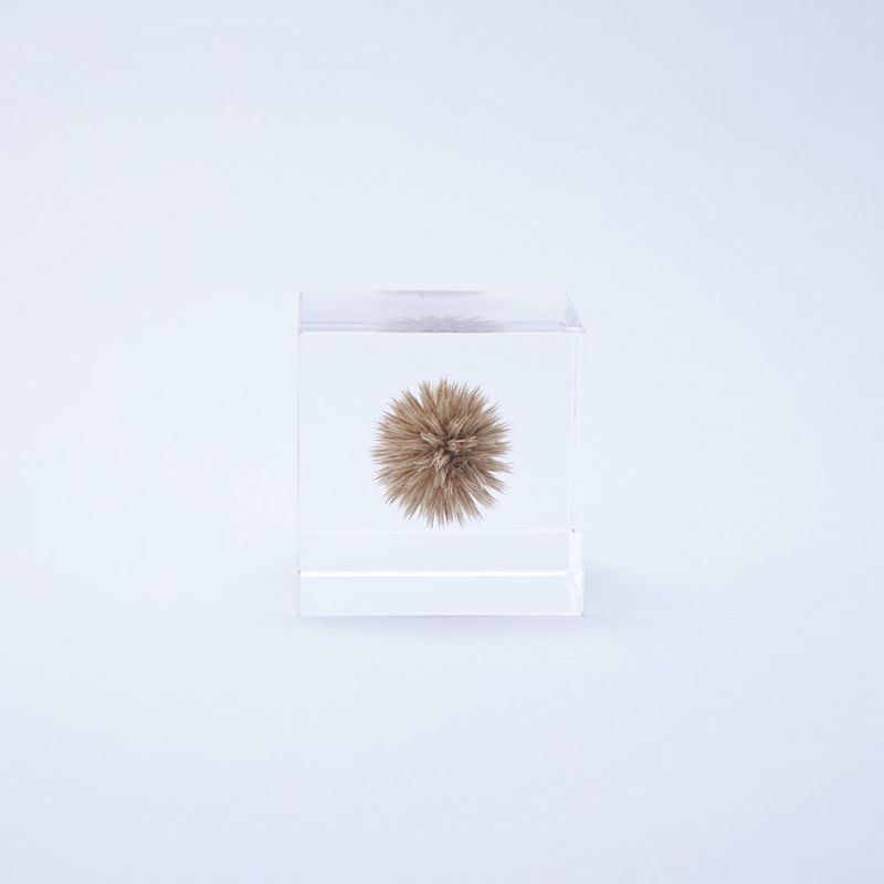 Sola Cubes, crafted by Usage No Nedoko in Kyoto, embody this philosophy. These cubes combine traditional Japanese values of reverence for nature and appreciation of overlooked elements. Encased in hand-polished crystal clear acrylic resin, each cube holds a preserved leaf, seed, or flower, offering a meditative glimpse into nature’s beauty—similar to Kuramata’s “Miss Blanche,” but using real organic materials.