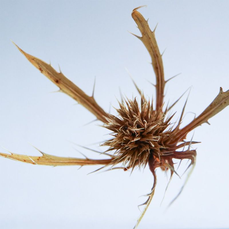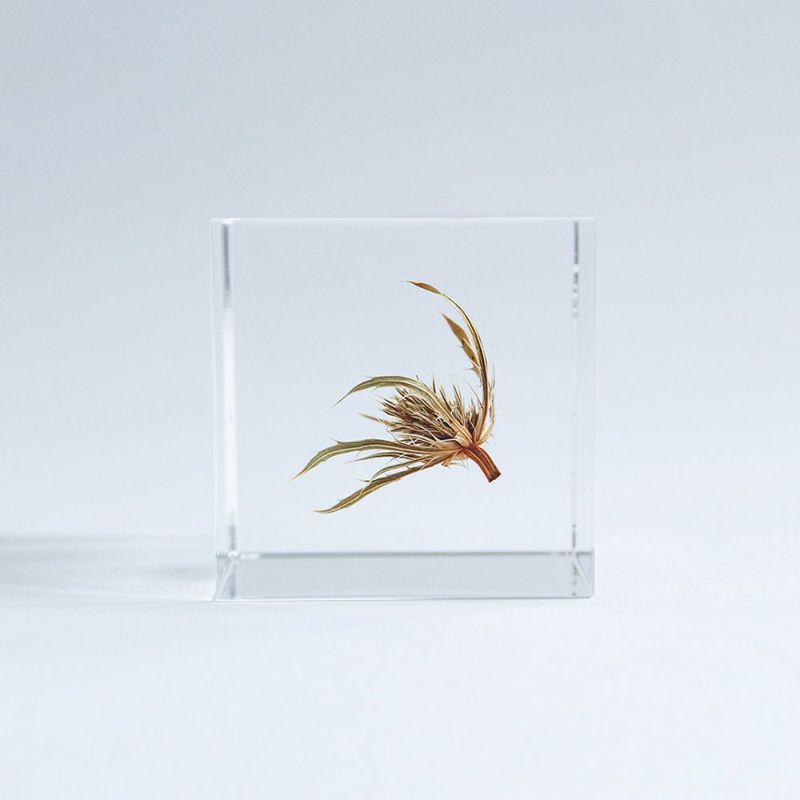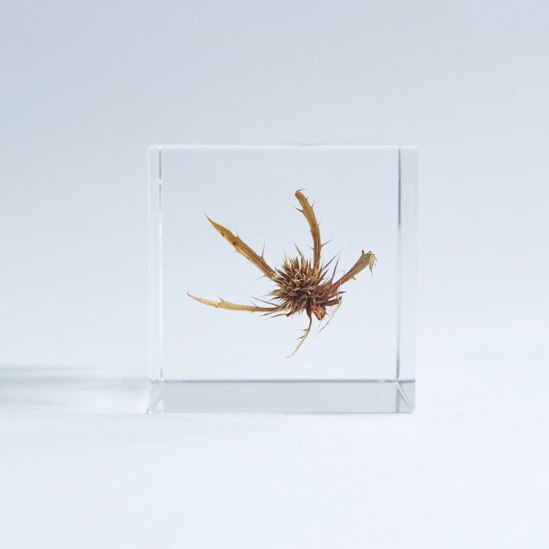 The Sola Cube Sea Holly Decor features a naturally preserved Sea Holly plant encased in clear acrylic resin. Handcrafted in Kyoto by Usage No Nedoko, each cube is a unique piece that captures the beauty of nature in a minimalist form. Inspired by Shiro Kuramata’s design philosophy, this decorative object offers a meditative connection to the natural world. The Sea Holly, known for its resilience and protective thorns, symbolizes endurance and subtle elegance. Perfect for desks, shelves, or as a thoughtful gift.