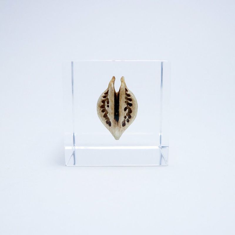 The Sola Cube Tiger’s Claw is a handcrafted decor piece from Kyoto, featuring a real preserved seed pod encased in crystal-clear acrylic resin. Inspired by nature’s design, this unique desk ornament showcases organic beauty and makes a thoughtful gift. Each piece is handmade, ensuring natural variations in shape and color. Display indoors away from direct sunlight and heat to preserve its appearance.