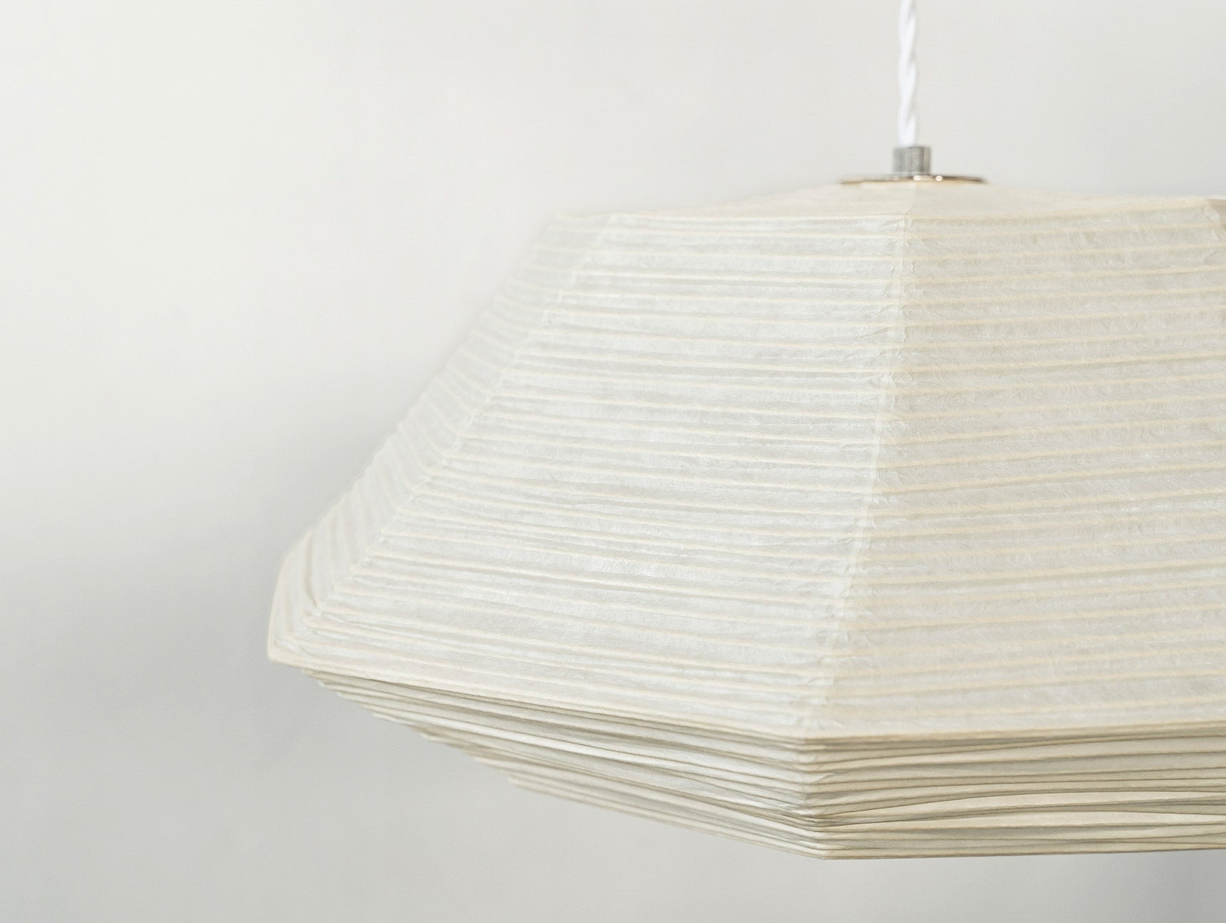 The Toshiyuki Tani TAMA pendant light combines traditional Japanese lantern craftsmanship with modern design. Handcrafted in Kanagawa, Japan, this fixture features washi paper (PET resin) and bamboo, creating a warm interplay of light and shadow. It includes an E27 LED bulb (2700K) and comes with a white cord; additional cable color options are available in-store. Dimensions: W46 x D46 x H19 cm.
