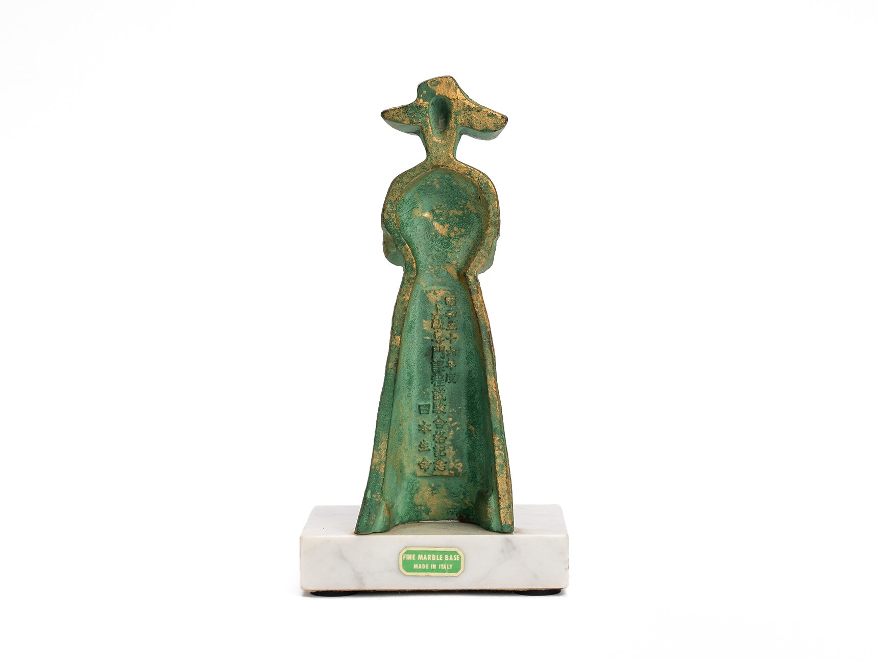 This vintage Italian commemorative bookend features elegant bronze castings mounted on a sturdy marble base. Crafted in Italy with high-quality molded bronze, it stands in mint condition. Perfect for adding sophistication to your desk or as a thoughtful gift. Dimensions: L11 x D8 x H12.5 cm.