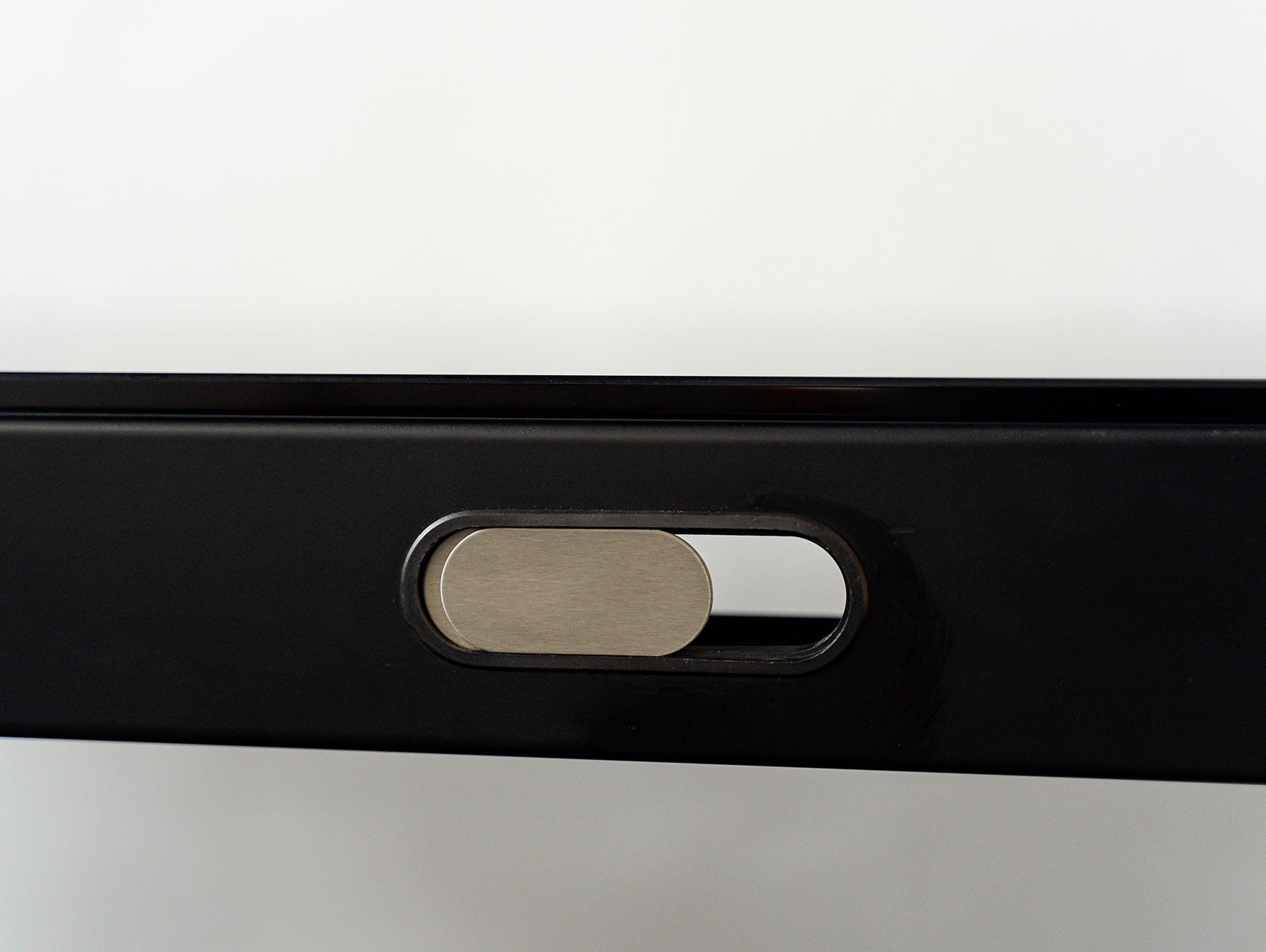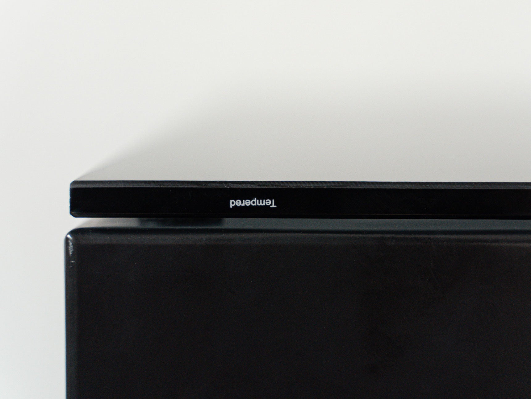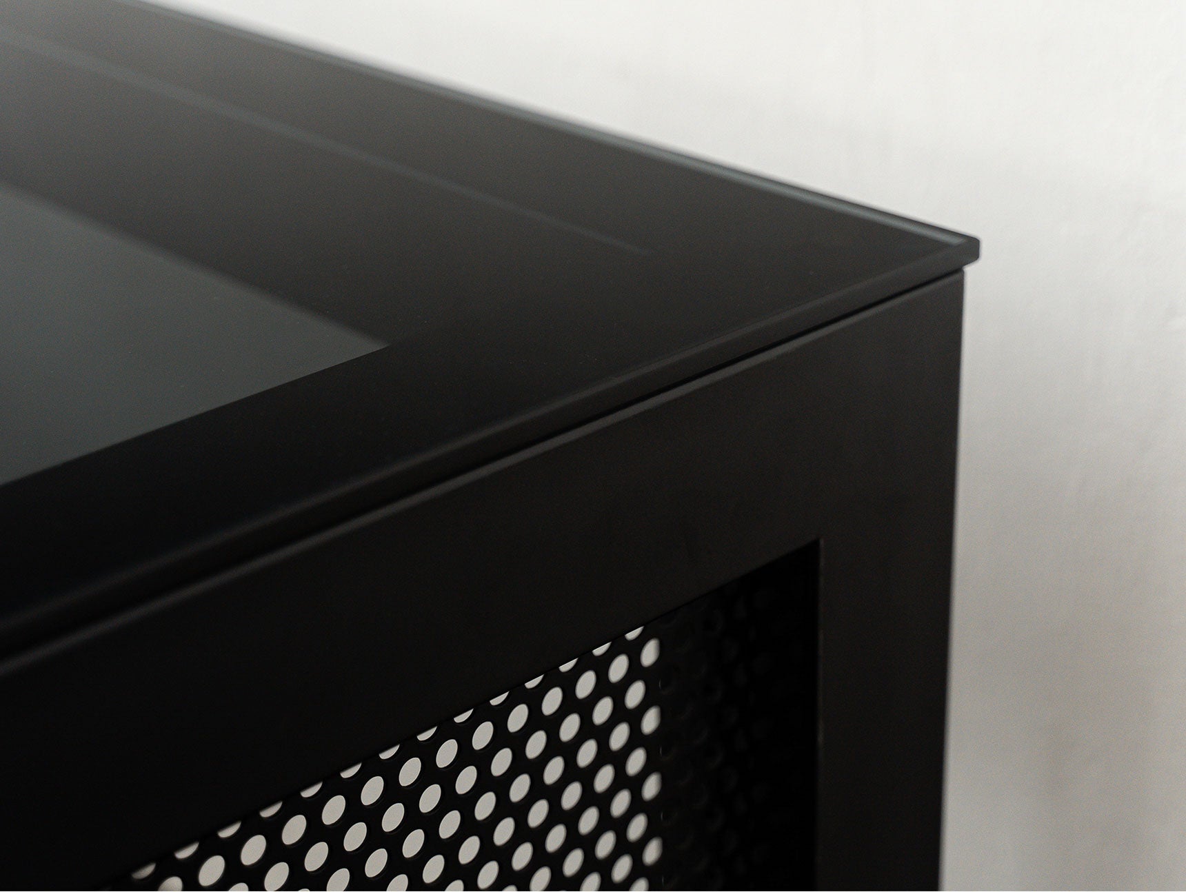 A stylish vintage perforated glass dining table with a modern industrial steel frame. Ideal for dining with 4 or as a dual-purpose desk for 2. Features hidden storage, internal cable management, and a sleek matt black finish. Constructed from tinted tempered glass and perforated steel. Condition: Mint. Sourced from Tokyo. Dimensions: L165 x W82 x H76 cm.