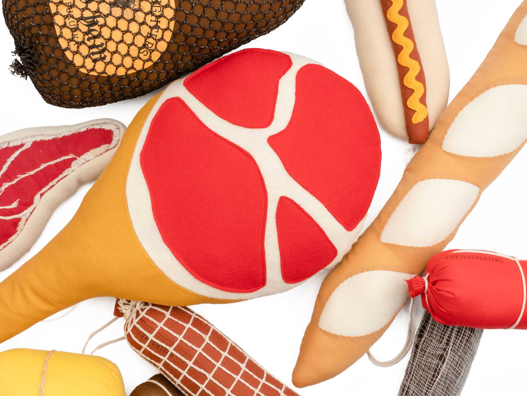 YUKI & DAUGHTERS, founded in 2005 by Yuki Matsuo, creates imaginative inedible foods with a humorous twist. This handmade kosher salami ornament is crafted from polyester, measuring Ø6 x H25 cm (excluding string). A quirky, durable decor piece from Fukuoka, Japan, perfect for gifting or adding character to any space.